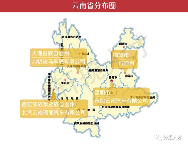 由图可见,云南的汽车从机厂少之又少,全数是以出产制制为核心的,次要缘由正在于云南位于中国西南的边陲,资本供给以及交通供给等前提都有所未便,除了云南本地人和邻人省市,绝大大都员工,出格是设想研发类人才不会把云南做为本人工做地的首选。